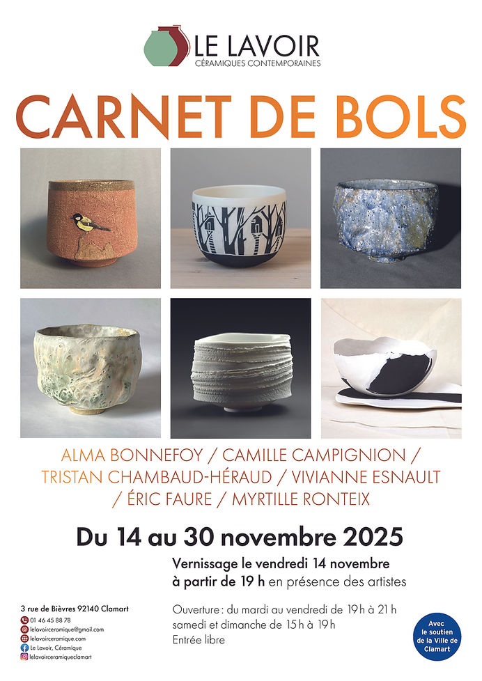 Le Lavoir est heureux de renouer avec la traditionnelle exposition des bols de fin d'année. Les cinq artistes présentées aujourd'hui explorent différentes voies d'expression, essentiellement sur porcelaine : les émaux riches et épais de Françoise Blain, les paysages graphiques japonisant d'Anne Drugeon, les subtils engobes gravés de Laetitia Leclere, la palette infinie de Lise Meillan, et la géométrie ciselée des grès de Céline Naud.